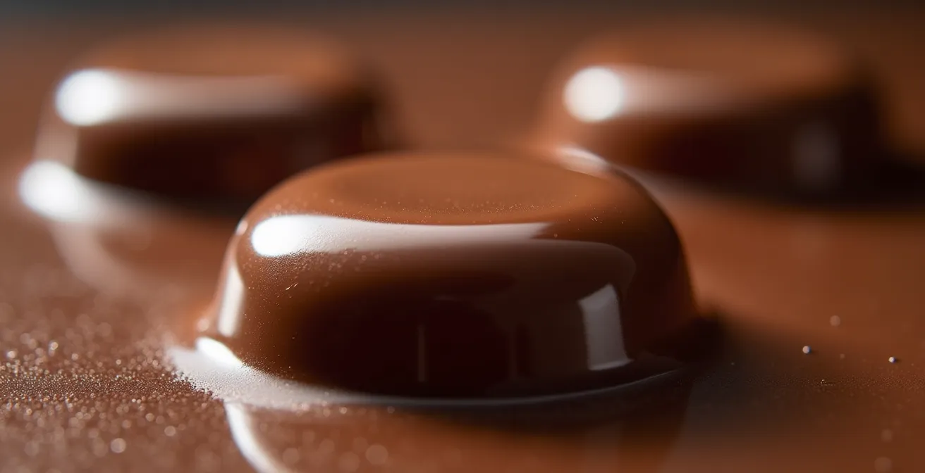 This surface moisture dissolves some of the sugar in the chocolate. As the water evaporates, the sugar is left behind, recrystallizing into a fine, white, gritty layer. This is sugar bloom. It is not harmful, but it is visually unappealing and creates a dry, sandy texture that ruins the customer experience. The critical environmental factor is the dew point; if the chocolate’s surface temperature is below the dew point of the room, condensation is inevitable. This is why it is noted that condensation occurs on ganache when humidity exceeds 65% relative humidity, especially with a significant temperature differential.