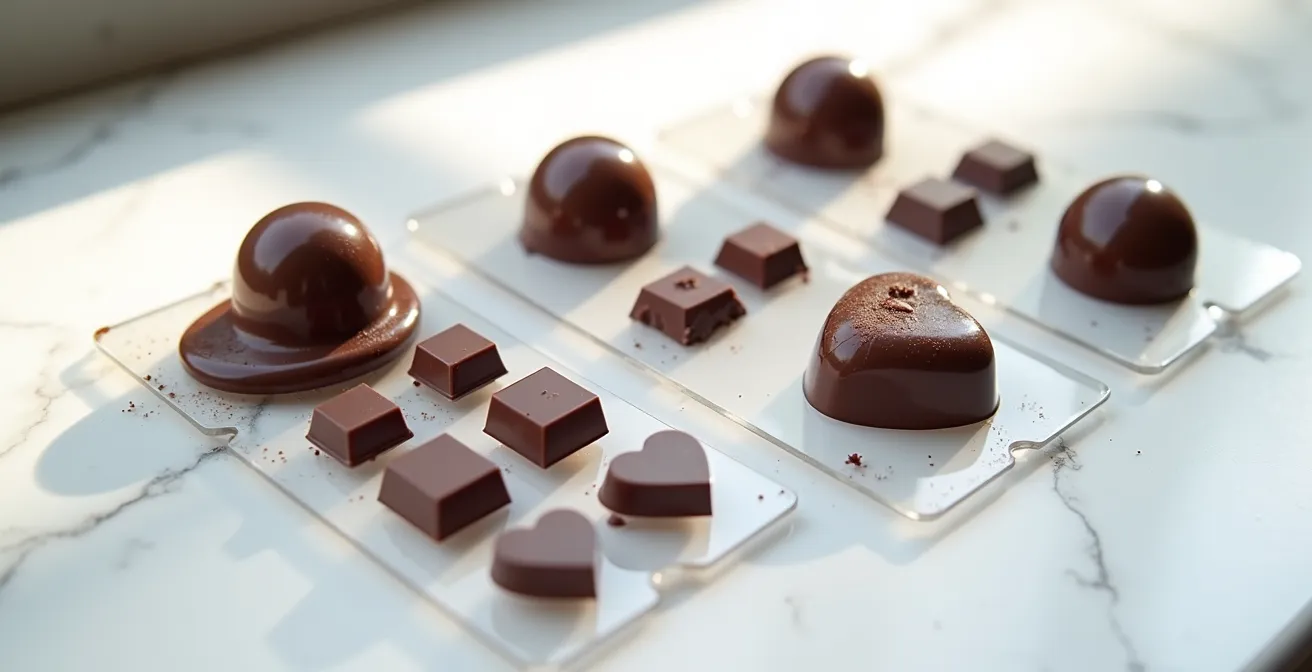 Many begin with flexible silicone molds, prized for their easy release and low cost. However, this very flexibility is a fundamental barrier to achieving the hallmark of a high-end praline: a flawless, glass-like shine and a sharp, satisfying “snap.” The secret to that professional finish doesn’t lie in a secret technique, but in understanding the material science at play. The true key is the interaction between the crystalline structure of tempered chocolate and the physical properties of its container.