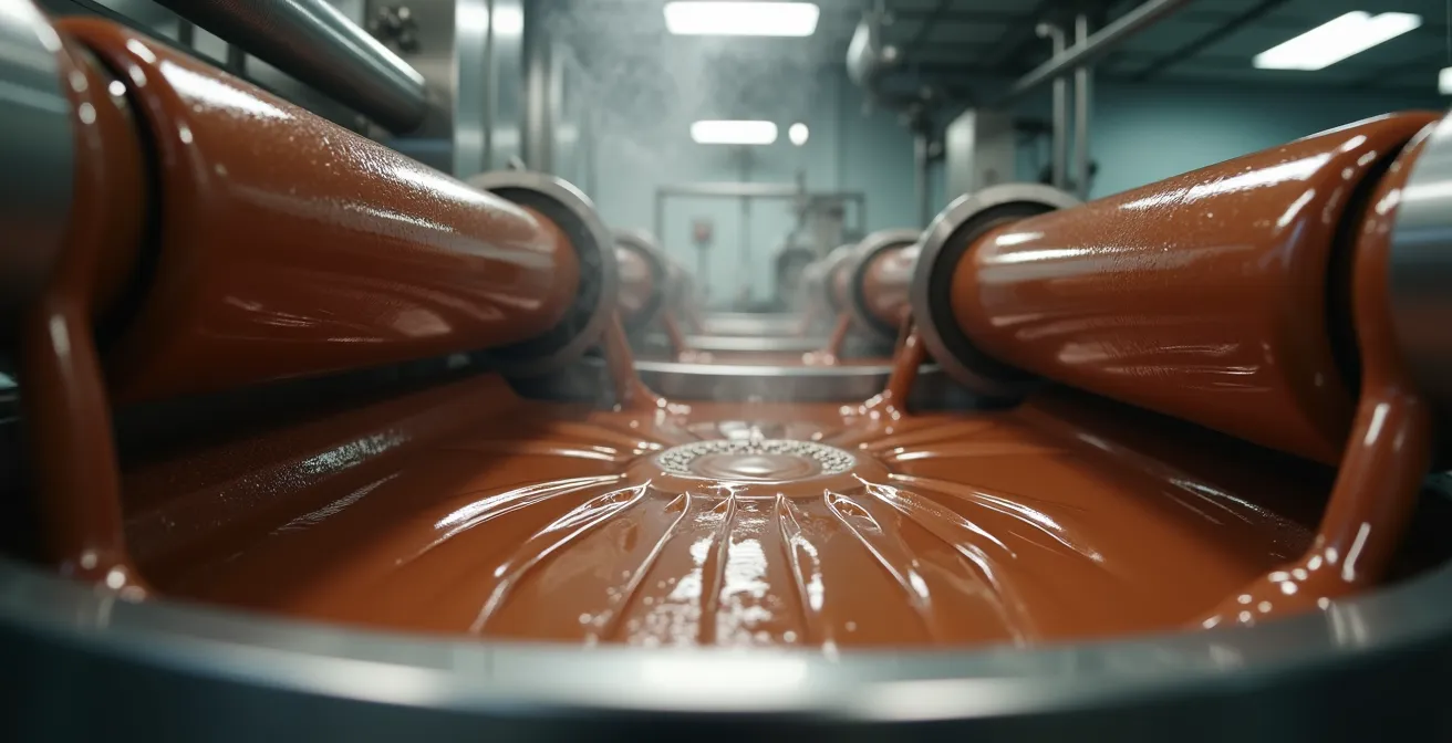 However, the second, equally crucial role of conching is purely mechanical and rheological. It is about texture. A scientific study published in PNAS highlights that a key function is the mechanical breakdown of aggregates and the reduction of interparticle friction. In simpler terms, the conche doesn’t just mix; it uses shear force to break apart microscopic clumps of sugar and cocoa particles and, most importantly, to coat every single solid particle with a thin, lubricating layer of cocoa butter. This coating is what transforms a gritty, thick paste into a fluid, silky liquid.
